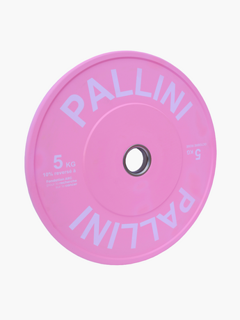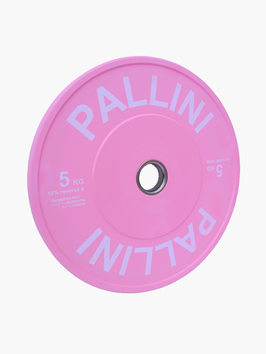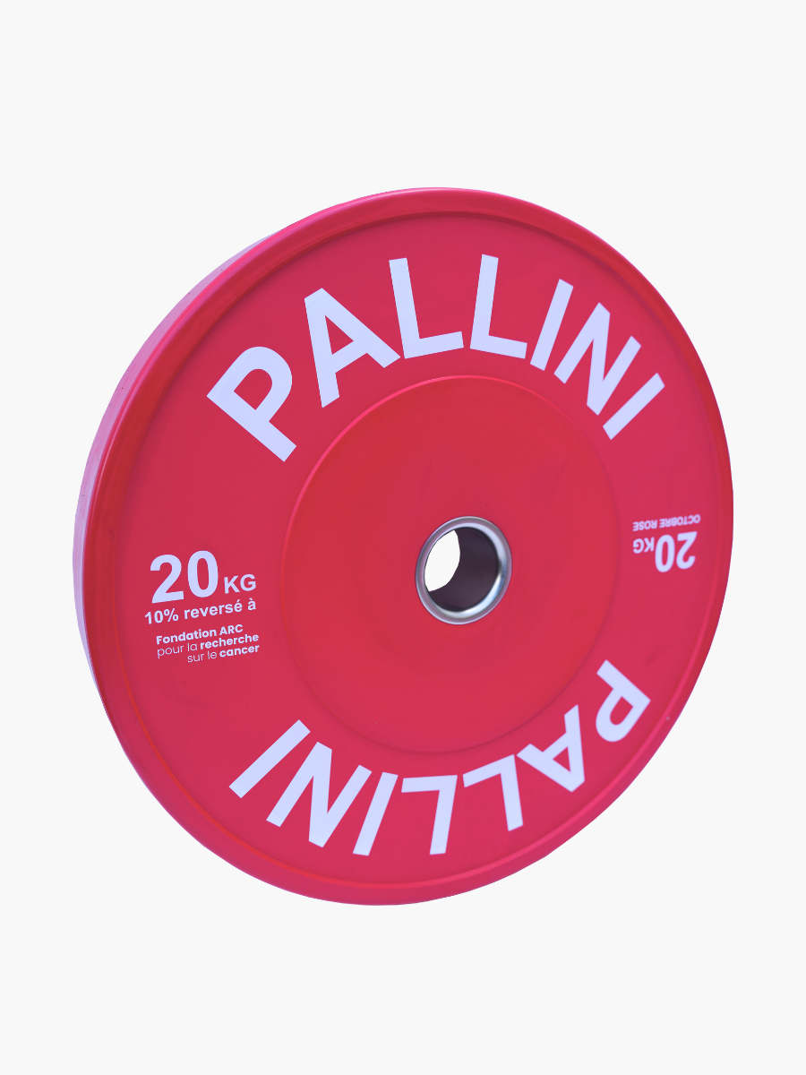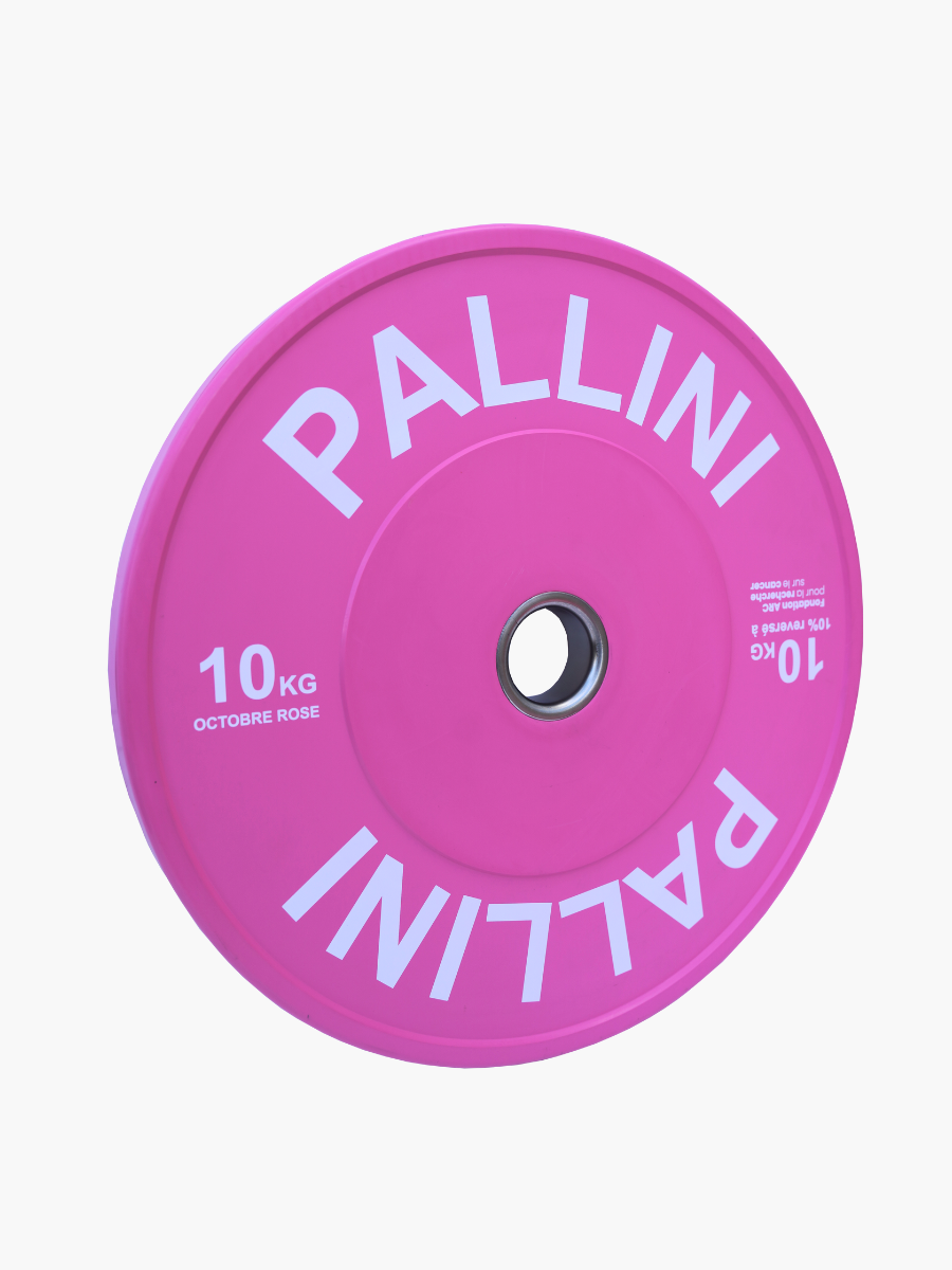 Performance Bumper Plates PALLINI - PINK OCTOBER manufactured according to IWF standards . These plates offer minimal rebound and are designed for intensive use. Made with hard rubber and a galvanized steel ring, they offer optimal durability and are easily recognizable thanks to their color.