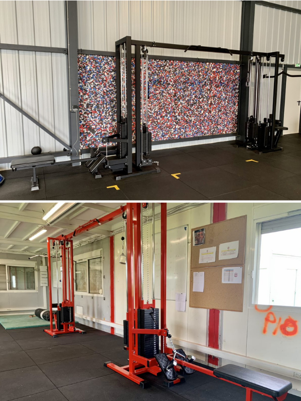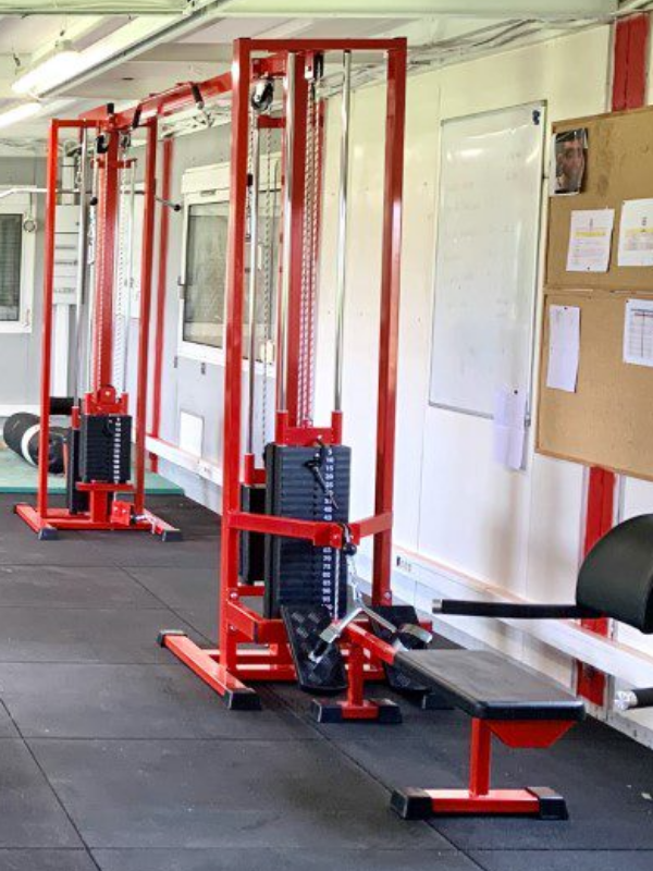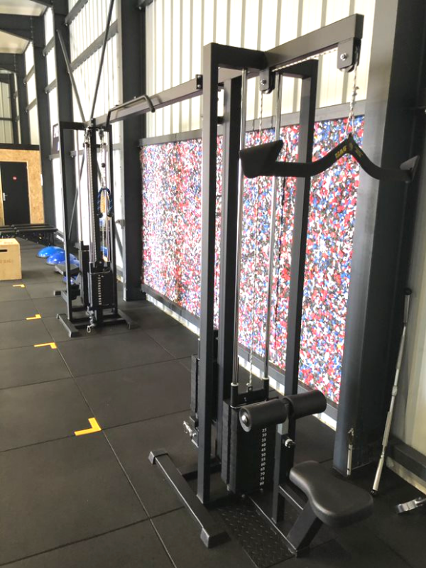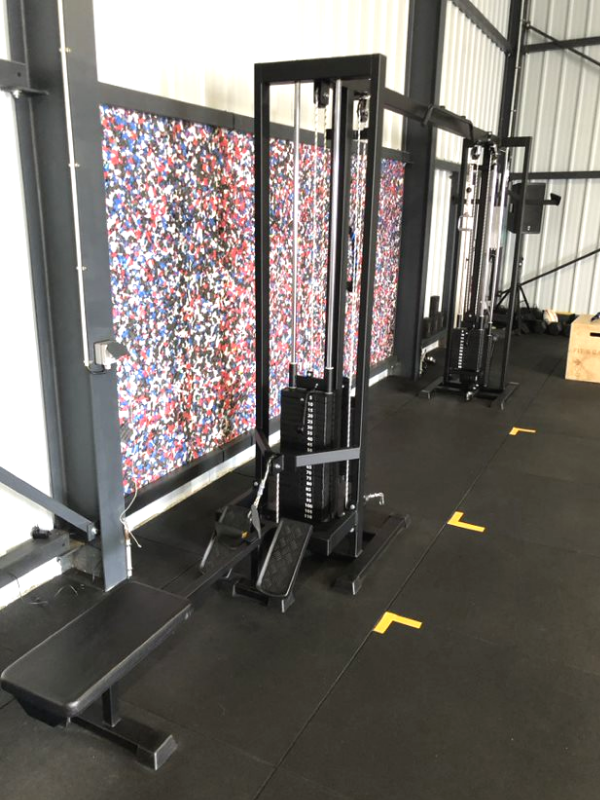 Visible pulley with upper pulley + lower pulley. Each pulley has independent load plates.