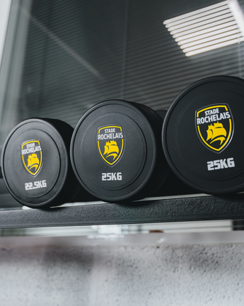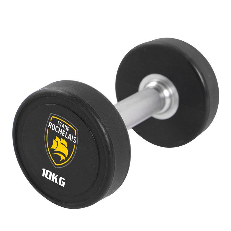 Custom PU dumbbells, personalized with your club's colors. For weight training. Available in sets from 2.5kg to 50kg minimum. Weights up to 100kg available.