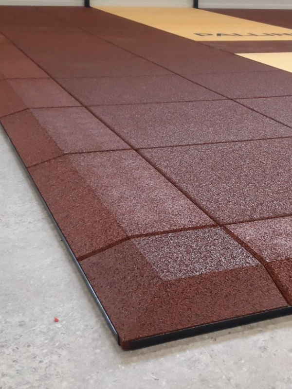 High-density (1100kg/m³) gently sloping impact-absorbing mats, made in France, are used for weightlifting equipment. These premium mats reduce weight plate wear upon impact with the floor, as well as noise and vibration. They are installed on all our training platforms and gym floors.