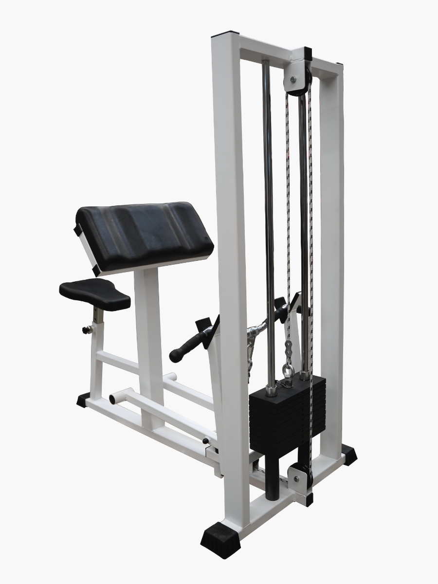 Biceps workout: The exercise is performed in a seated position, with arms resting on the seat. The effort is generated by bringing the bar towards the shoulders (supination).