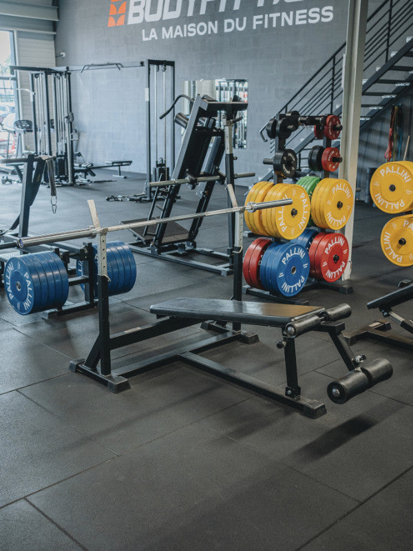 Bench allowing the execution of the decline bench press exercise, engaging the lower part of the pectoral muscles as well as the deltoid and triceps muscles.
